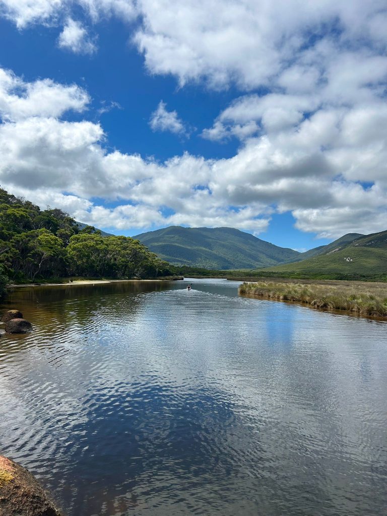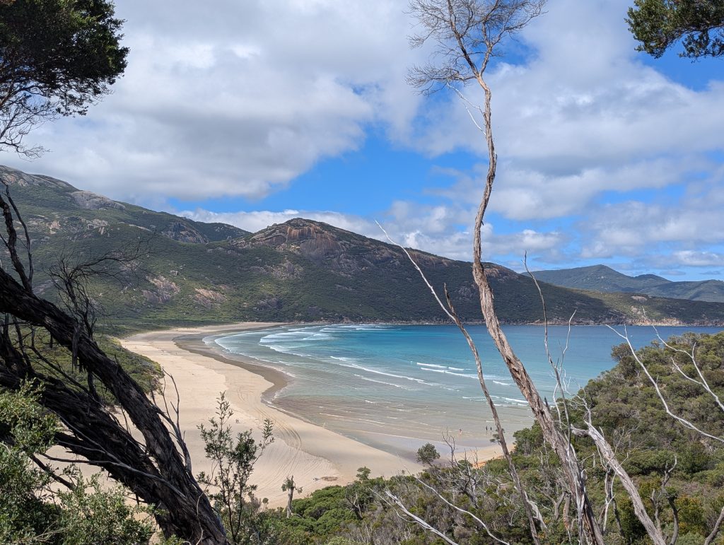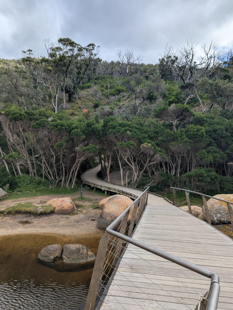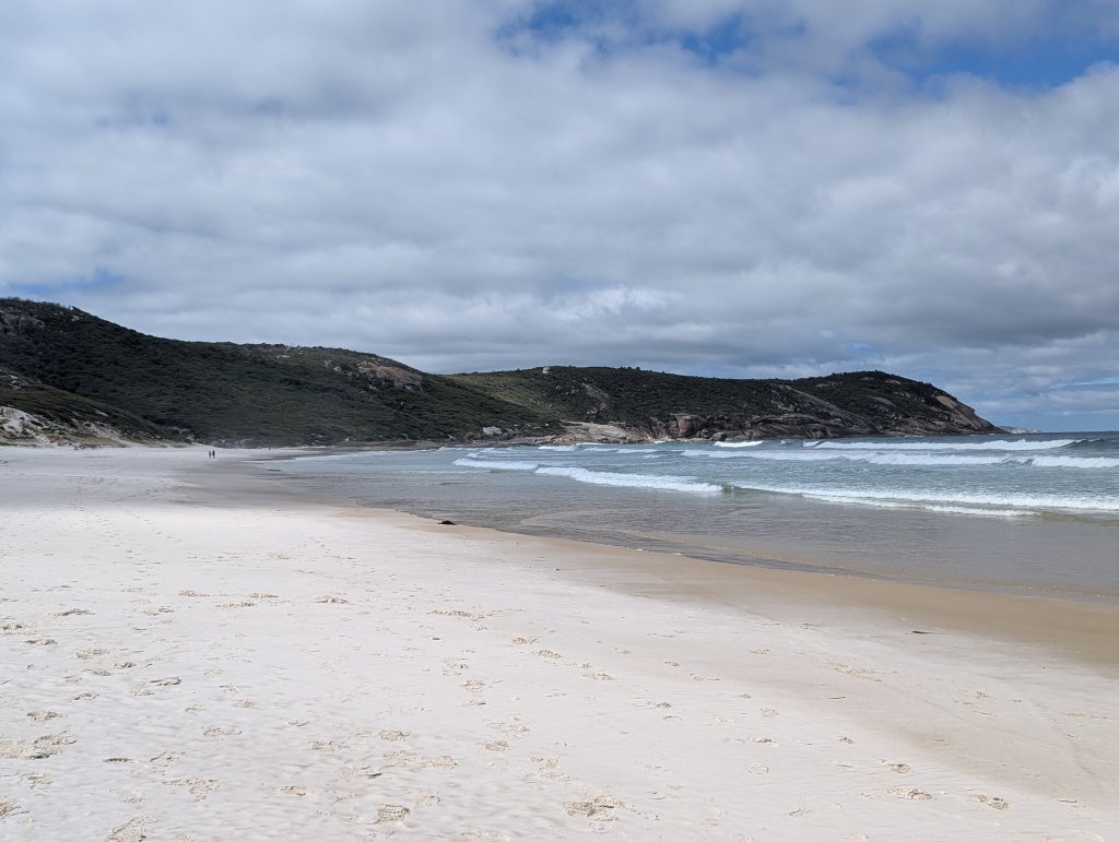 We first found the footbridge over the River Tidal and then walked for quite a considerable amount of time, a lot of it uphill. Eventually we got to the crest and could see the beach from a distance. After a while we made it down onto the lovely white sand, it wasn’t squeaking at this stage but definitely felt a bit more grainy underfoot. We then walked the length of the beach to clamber on the huge rocks at the end of it. It was here we started to hear the squeaks when you walked (dragging your feet slightly).