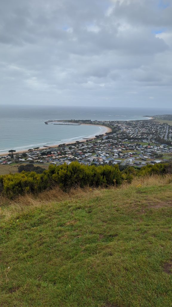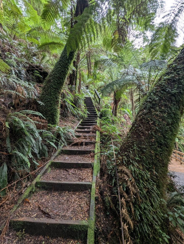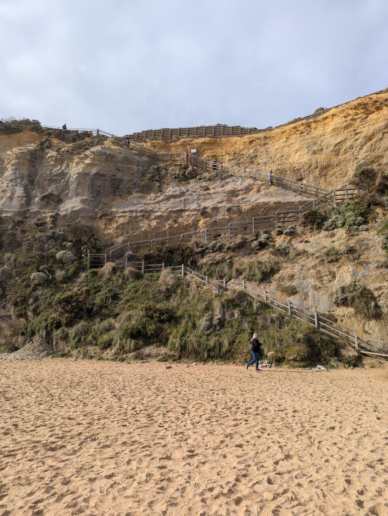 By the time we set off at 9 the rain had stopped but it was a chilly 11 degrees. 1st stop was only a 4 min drive to Marriners Lookout. It was a 6 min steep walk to the viewpoint but the view over Apollo Bay was still fab despite the greyness.