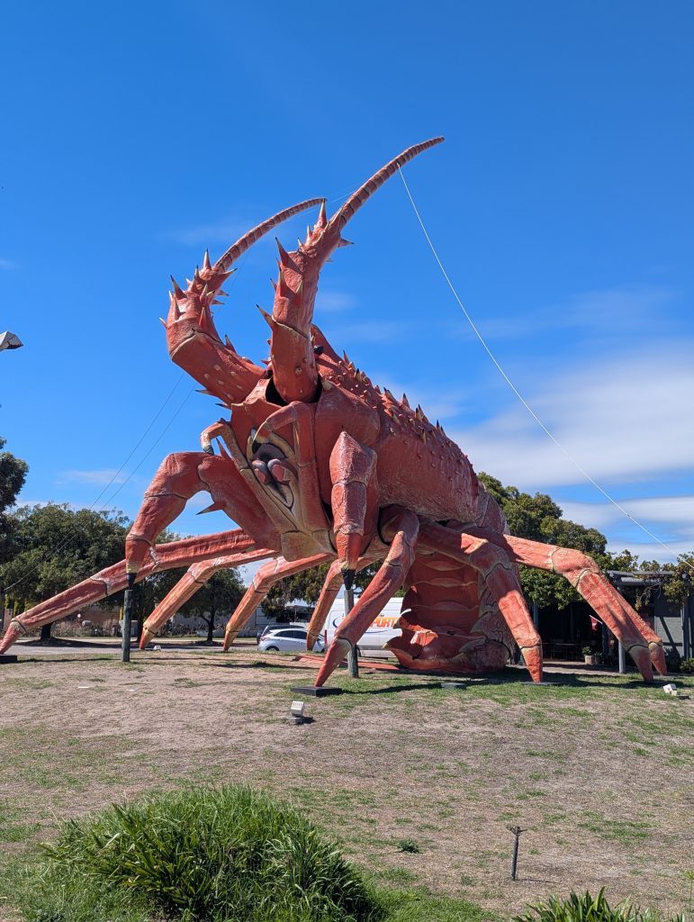 Feeling a little peckish we stopped at a cafĂ© named Bliss by the Sea for a wrap and muffin. After buying some milk, bread, crisps and hot cross buns at the local supermarket we took a picture of the big Lobster and began making our way to Meningie – Lake Albert Caravan Park.