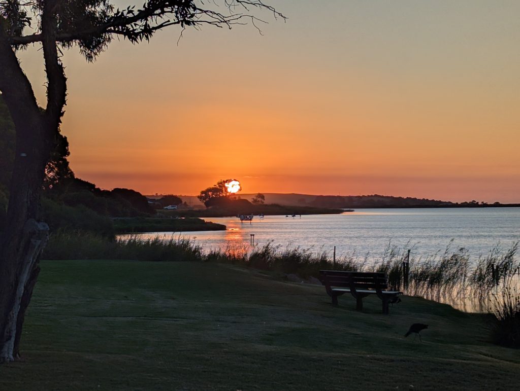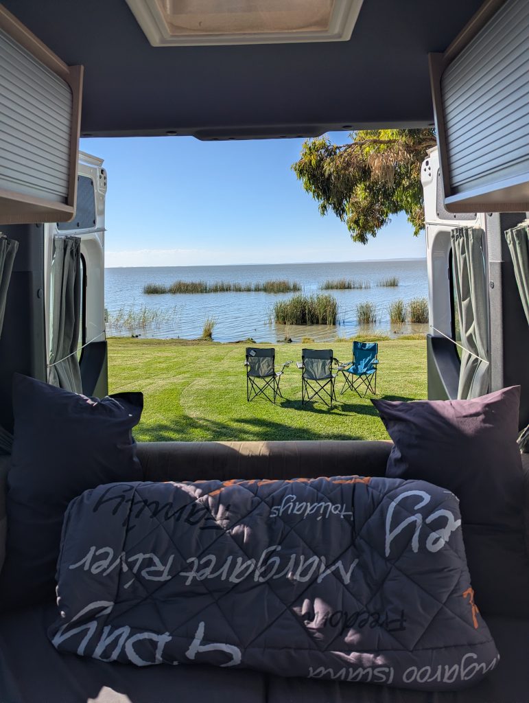 Eventually we got to Meningie and drove along the lake front to get our bearings in this small town. Then to the campsite and we had come up trumps, we had a beautiful lake view pitch so we set the chairs out immediately and had a beer while watching the pelicans on Lake Albert.
