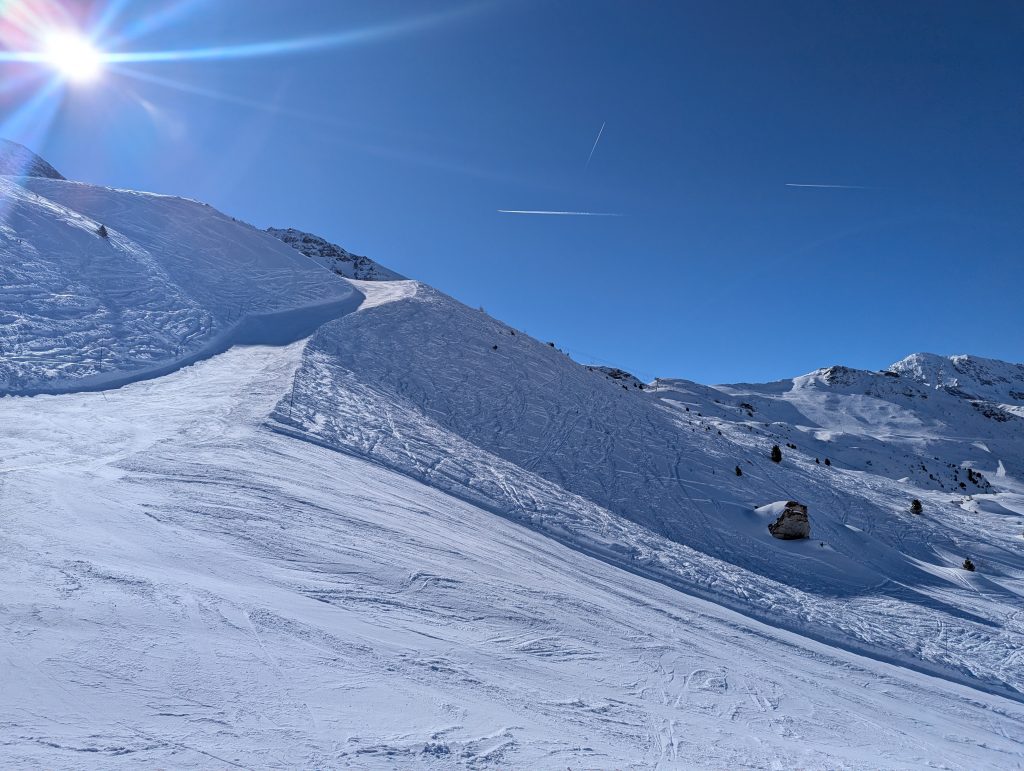 Lunch was paninis in a cafe down in Lanslevillard once again sitting in brilliant sunshine. The temperature just above zero but at the top of the slopes it was around -10.