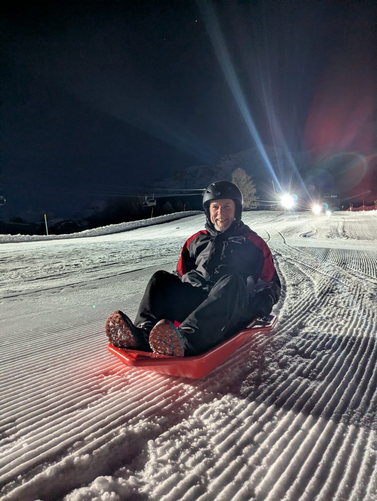 After a quick shower we put our ski clothes back on as we were going to get the free shuttle bus back to Lanslevillard to do an evening toboggon run. It was so weird getting the chairlift up the slope without skis.