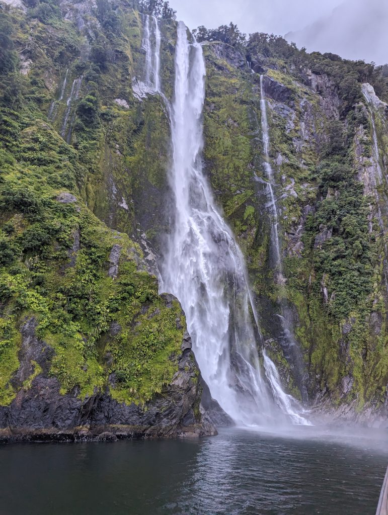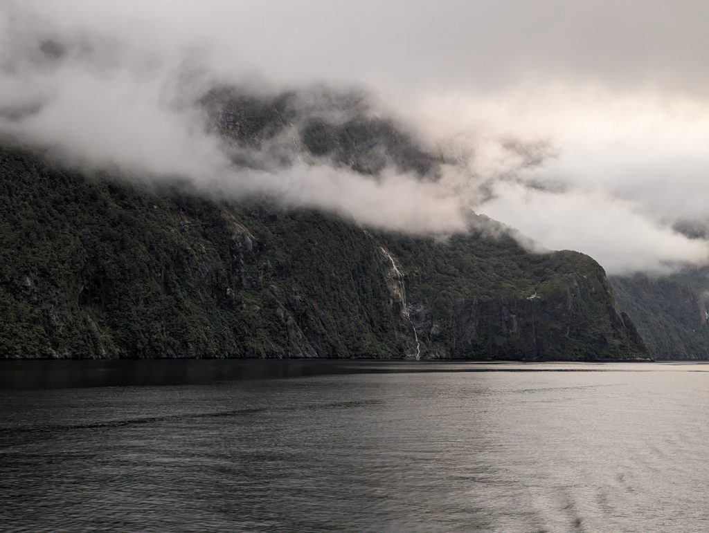 Rudely awoken by the alarms this morning at 6.30. A quick shower and dressed, as breakfast (full English) was at 7.00 whilst the boat left the shelter of Harrison Cove to travel all the way up Milford Sound and out to the Tasman Sea (this is the second roughest ocean in the world – great!). We were very lucky (well I was) as it was fairly calm and no incidents to report. We watched the sun come up over the mountain and saw a pod of dolphins, amazing to see them jumping in front of a cruise ship and also some seals. God knows what the temperature was but we were freezing on the deck, so we had to keep going indoors to warm up.