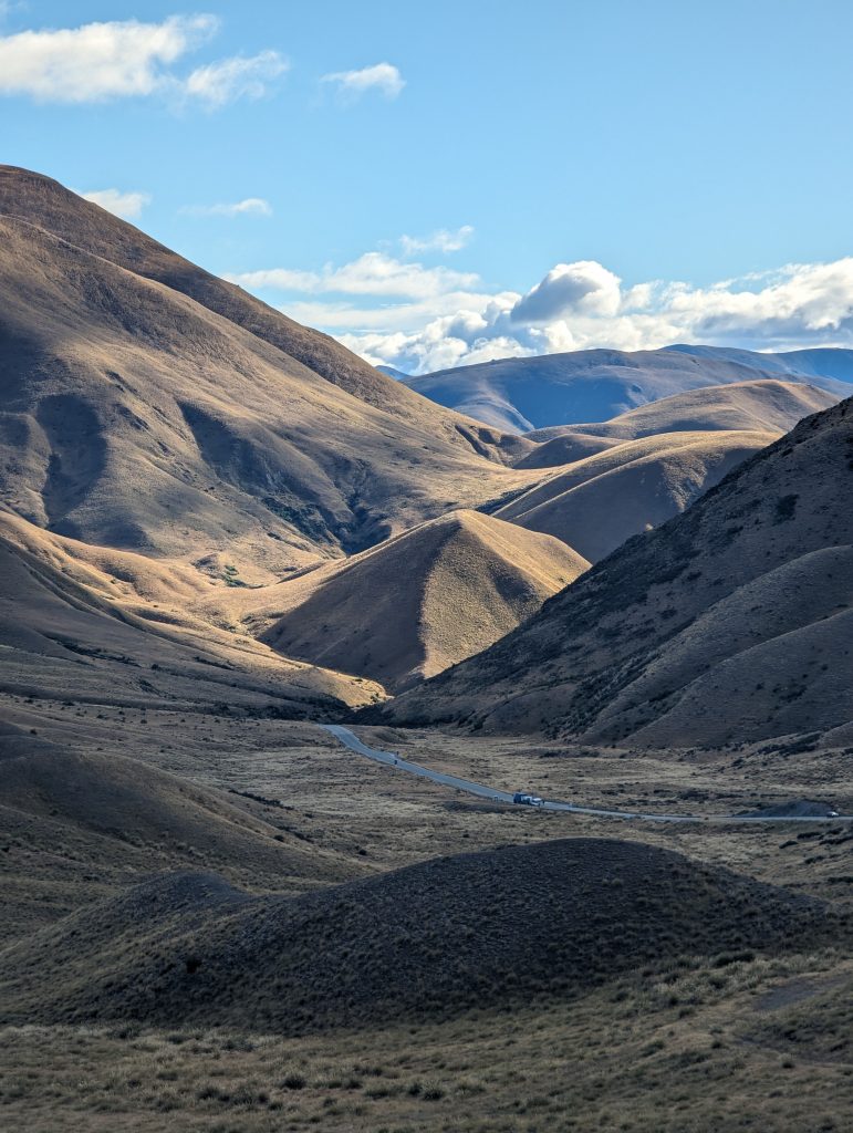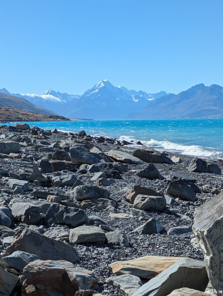 So we pressed on towards our campsite, now driving the full length of Lake Pukaki. We had a few photo stops at viewpoints along the way and at Peters Lookout we walked all the way down to the lake edge and back.
