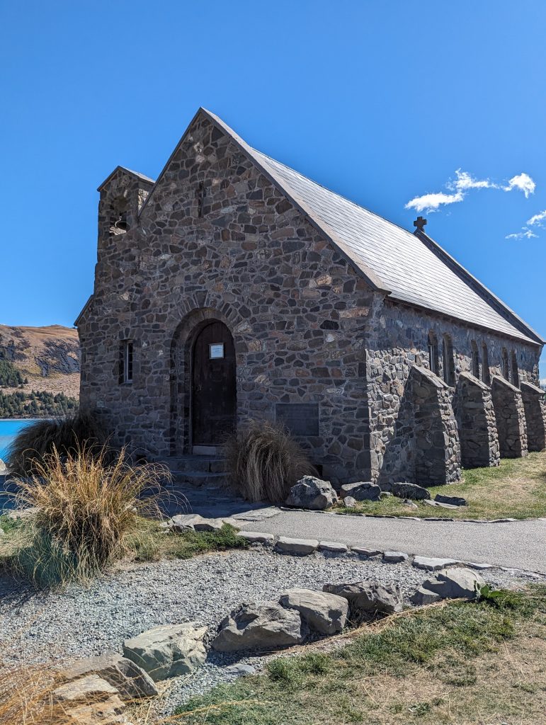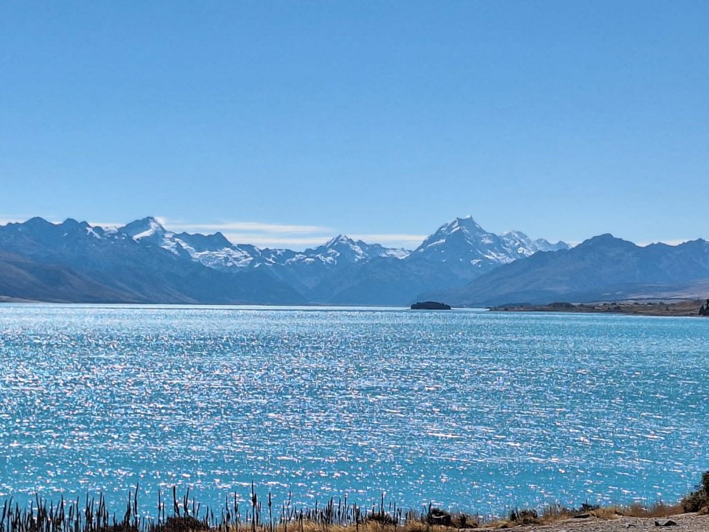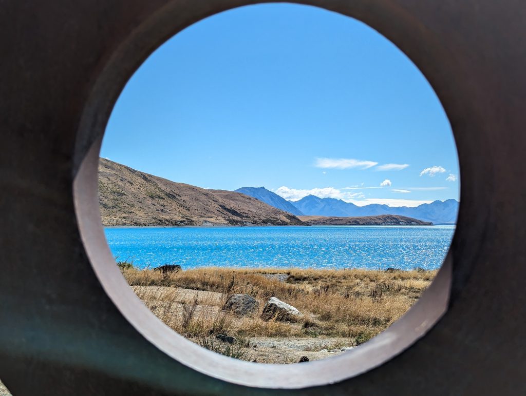 Our first stop Lake Tekapo, which we arrived at after a 3 hour drive, having driven over the Lindis Pass. The sun was blazing and the temperature around 27 degrees. We walked just over a mile and a half around the lake edge, over the bridge and saw The Church of the Good Shepherd (one of the most photographed buildings in New Zealand) and the dog statue. The colour of the water was unbelievable.