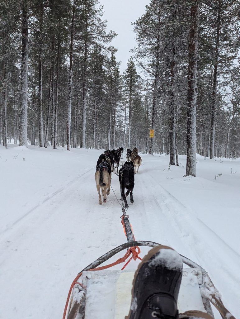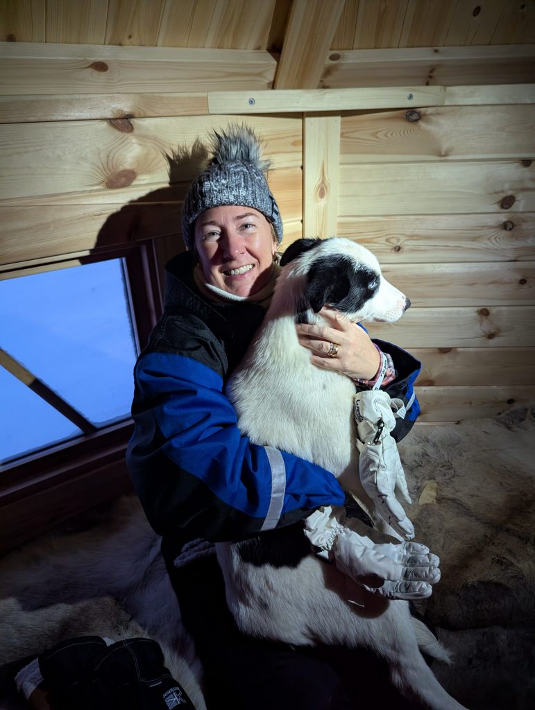At 9 we were bussed to the Northern Lights Village where we were going to go on a husky sleigh ride. First we met two puppies and somehow one ended up on my lap! We also had some hot juice in the wooden cabin with a fire going.