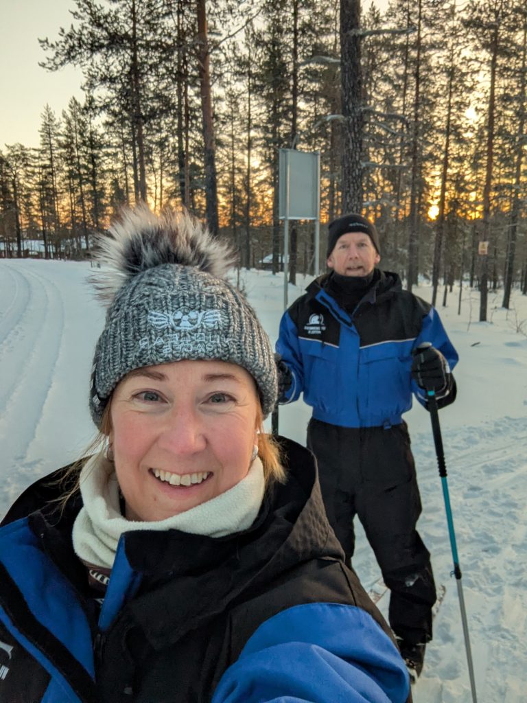 There were 10 of us (the danish family, the two guys from Italy, the German couple and us) for the skiing and the two instructors had our skis and poles ready and taught us how to put them on and the basics of how to cross country ski.