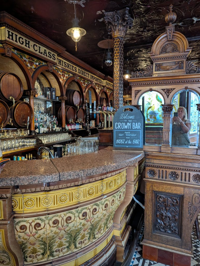 Next on our list was The Crown Liquor Saloon, a National Trust property, the pub dates back to 1826 and the fixtures and fittings are original. It’s definitely a bit quirky with individual booths. Obviously we had to have a drink here!