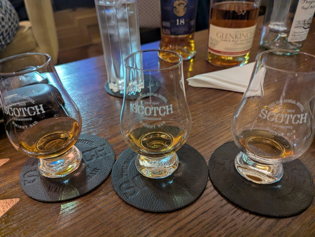 We were then shown to the Scotch Bar and presented with a whole book of whiskies to choose from. Dad took some advice and ended up with a Fragrant Drop from Orkney which we later discovered was 64.1 %! The good news though as it was a short measure left at the end of the bottle it was completely free!