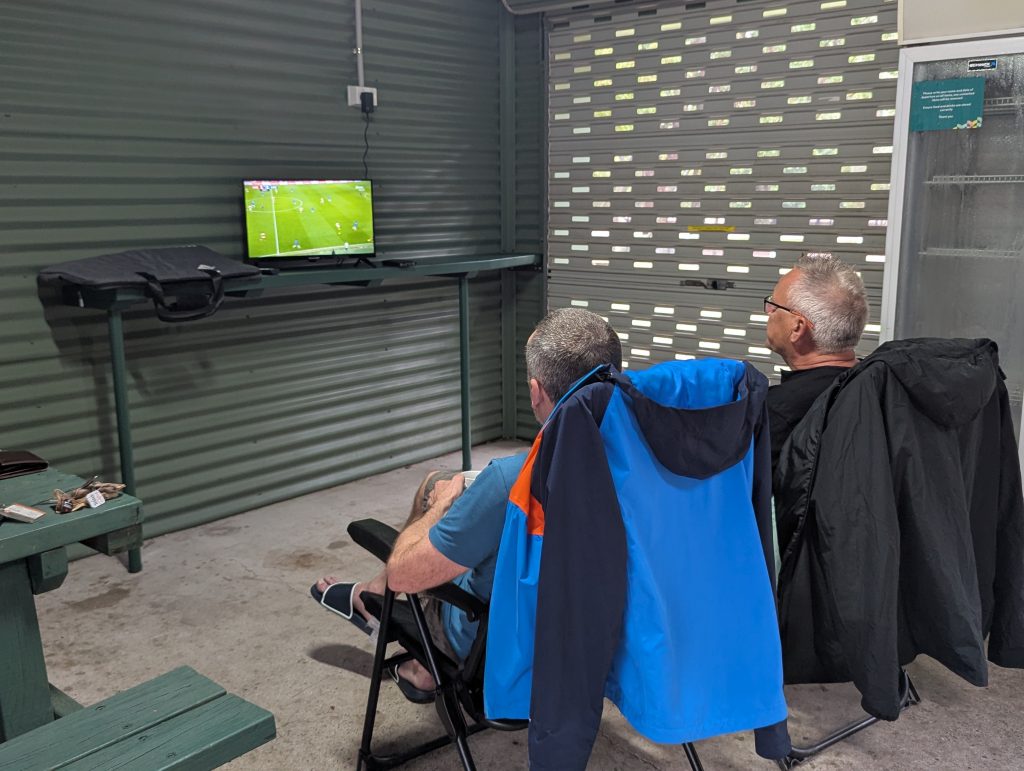 The alarms were set for 7.30 this morning (Monday) as Colin and Dave wanted to watch the Sunday late afternoon Arsenal/Chelsea game before seeing the scores on any social media, so they set themselves up with a TV and chairs in the camp kitchen.